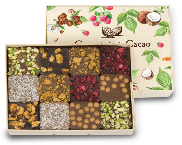 - Chocolats fourrés praliné feuilleté recouvert de chocolat noir ou lait: noisette, pistache, éclats de caramel aromatique, framboise, noix de coco.