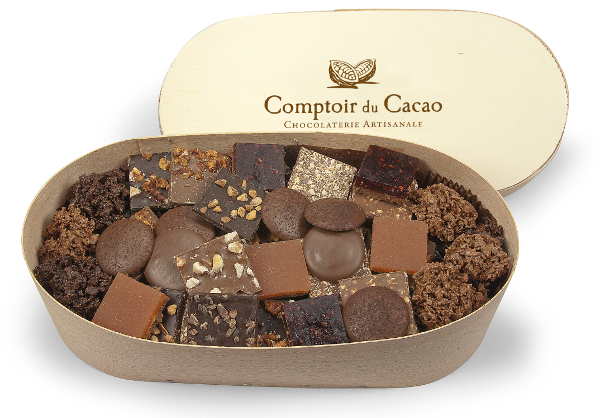 - Bouchées de chocolat et brisures de crêpe dentelle: noires 72% aux oranges confites, Gianduja lait 36% au caramel beurre salé.