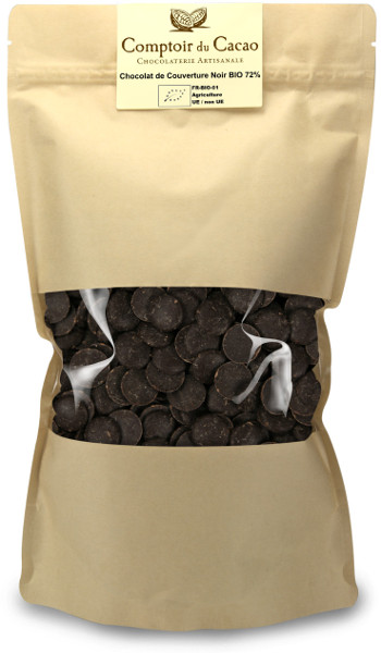 Ingrédients:Chocolat noir pur beurre de cacao (minimum de cacao 72%). Pâte de cacao*, sucre de canne*, beurre de cacao*. Peut contenir des traces de: lait. *Ingrédients issus de l'agriculture biologique. Les fèves de cacao sont originaires de Saint-Domingue, Pérou et Tanzanie.