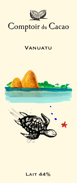 Ingrédients:Chocolat lait pur beurre de cacao (minimum de cacao: 44%). Sucre, beurre de cacao, pâte de cacao, poudre de lait entier, arôme naturel de vanille. Peut contenir des traces de: gluten, soja, fruits à coques. Les fèves de cacao sont originaires du Vanuatu.